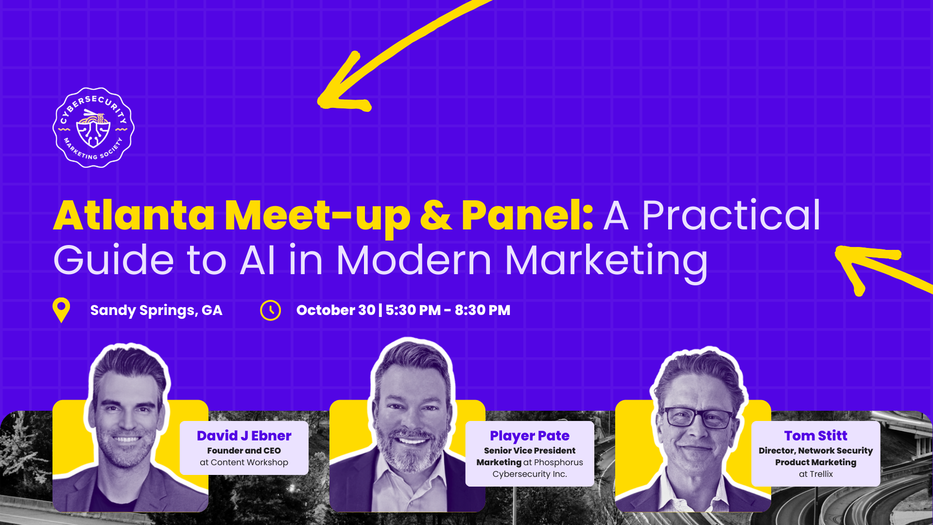 Join us for a networking event and panel on how you can use A.I. in your marketing today!. The Cybersecurity Marketing Society’s Atlanta chapter is hosting an evening of casual, fun networking and an expert-led A.I. for marketing education by some of our region’s leading voices. If you are in marketing, sales, or the business side of cybersecurity, join us to strengthen your local connections and learn something new!