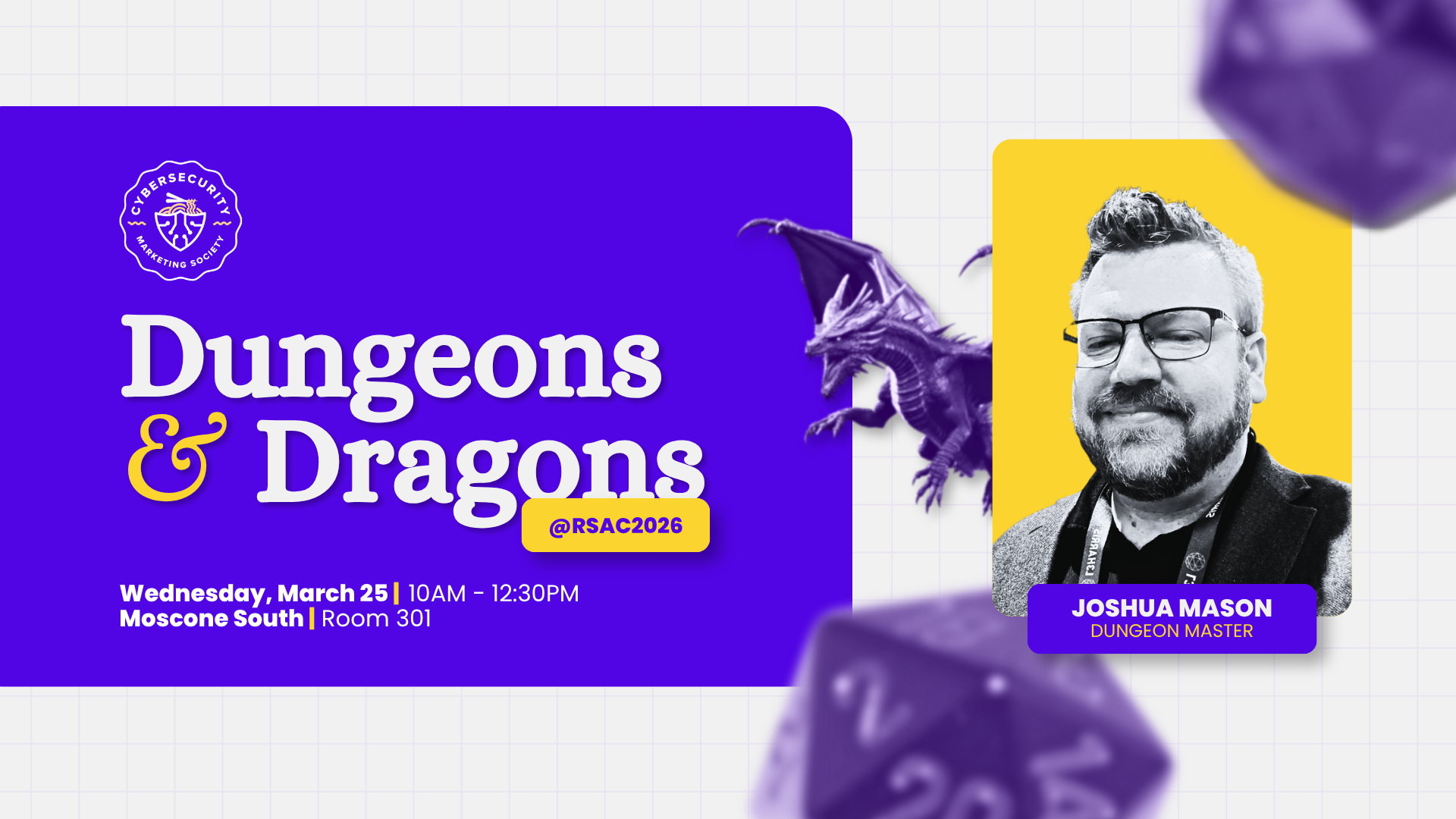 Join dungeonmaster, Joshua Mason, for a speed campaign inside Moscone South Room 301 from 10am - 12:30pm on Wednesday March 25th. RSAC Expo Badge or higher required to gain entrance. Seats available for the first 8 people who show up. Seats available to watch the campaign!