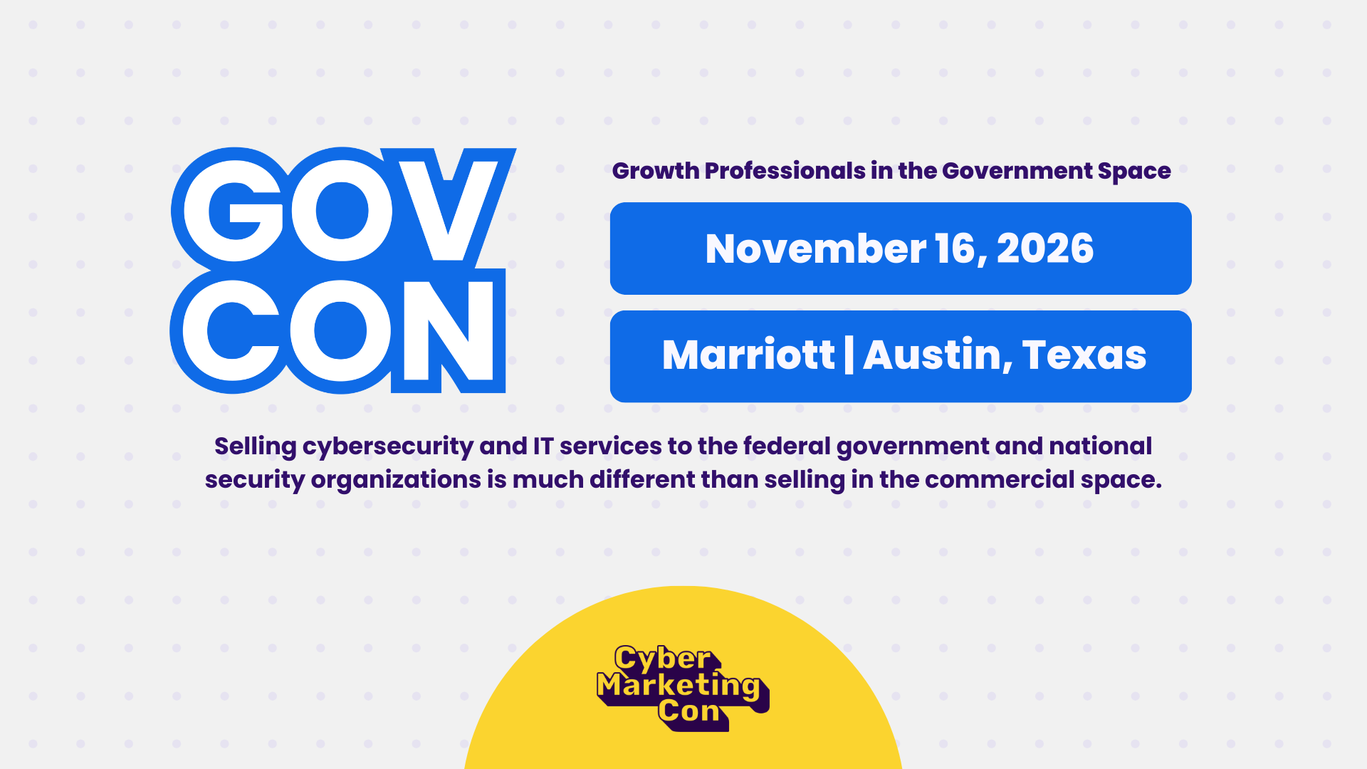 Selling cybersecurity and IT services to the federal government and national security organizations is much different than selling in the commercial space. Join the 1-day event inside CyberMarketingCon 2026 created just for those in business development, sales, capture, growth, and marketing to the government!